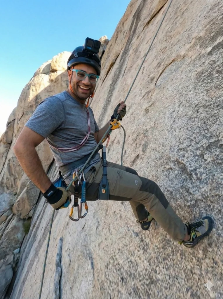 Ultra realistic rock climbing and rappelling action photography of the reference person descending a mountain wall on rappel, wearing proper climbing and rappelling gear including harness, rope, carabiners, climbing shoes and technical outdoor clothing, wide joyful smile showing confidence and enjoyment, side-angle composition capturing part of the rocky mountain wall and part of the open blue sky, dynamic body position suspended on the rope, strong natural body tension and fluid movement, dramatic sense of height and exposure, first-person GoPro camera perspective positioned slightly to the side, ultra wide-angle lens emphasizing depth, scale and vertical drop, highly dynamic frame with subtle motion blur in limbs and rope, bright natural daylight creating strong highlights on the rock texture and soft shadows, raw documentary-style composition with imperfect framing, real-life color grading, cinematic contrast, organic grain, ultra realistic rock, rope and fabric textures, no Al look, no plastic surfaces, no overprocessing